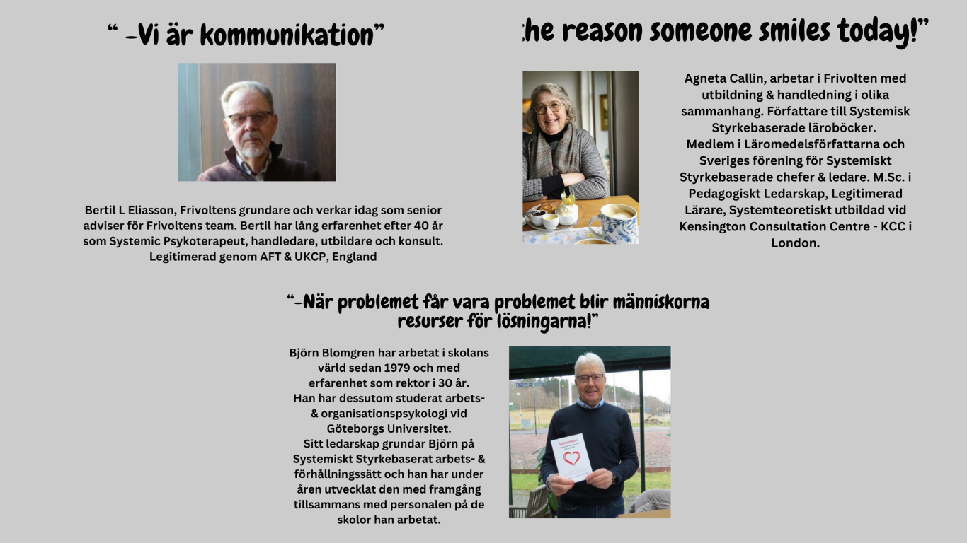 och arbetssätt – att skapa fler perspektiv i människors liv och tillvaro. Frivoltens team utvecklar och praktiserar Systemiskt Styrkebaserade teorier genom utbildning, handledning, konsultation och olika projekt. Vi möter organisationer och uppdrag utifrån deras unika förutsättningar och behov.